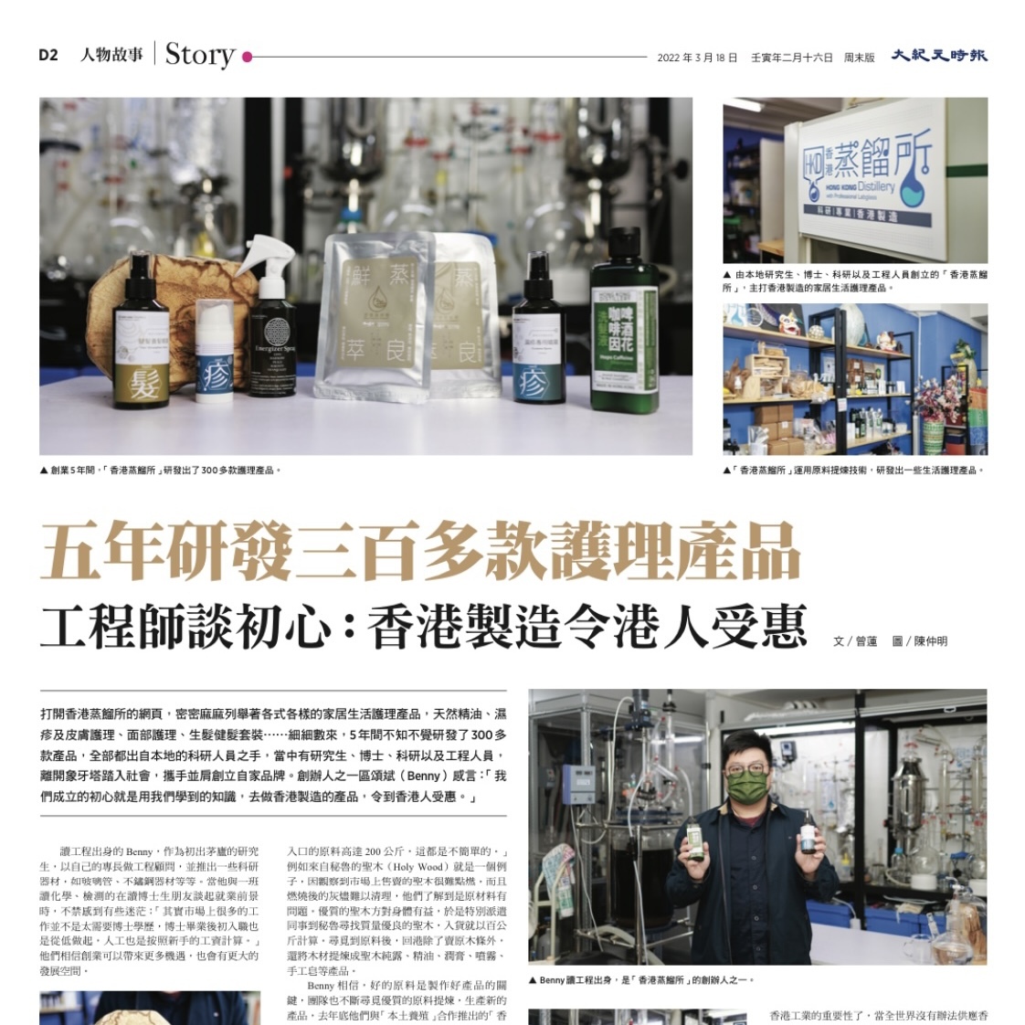 節錄: 打開香港蒸餾所的網頁,密密麻麻列舉著各式各樣的家居生活護理產品,天然精油、濕疹及皮膚護理、面部護理、生髮健髮套裝⋯⋯細細數來,5年間不知不覺研發了300多款產品,全部都出自本地的科研人員之手,當中有研究生、博士、科研以及工程人員,離開象牙塔踏入社會,攜手並肩創立自家品牌。創辦人之一區頌斌(Benny)感言:「我們成立的初心就是用我們學到的知識,去做香港製造的產品,令到香港人受惠。」