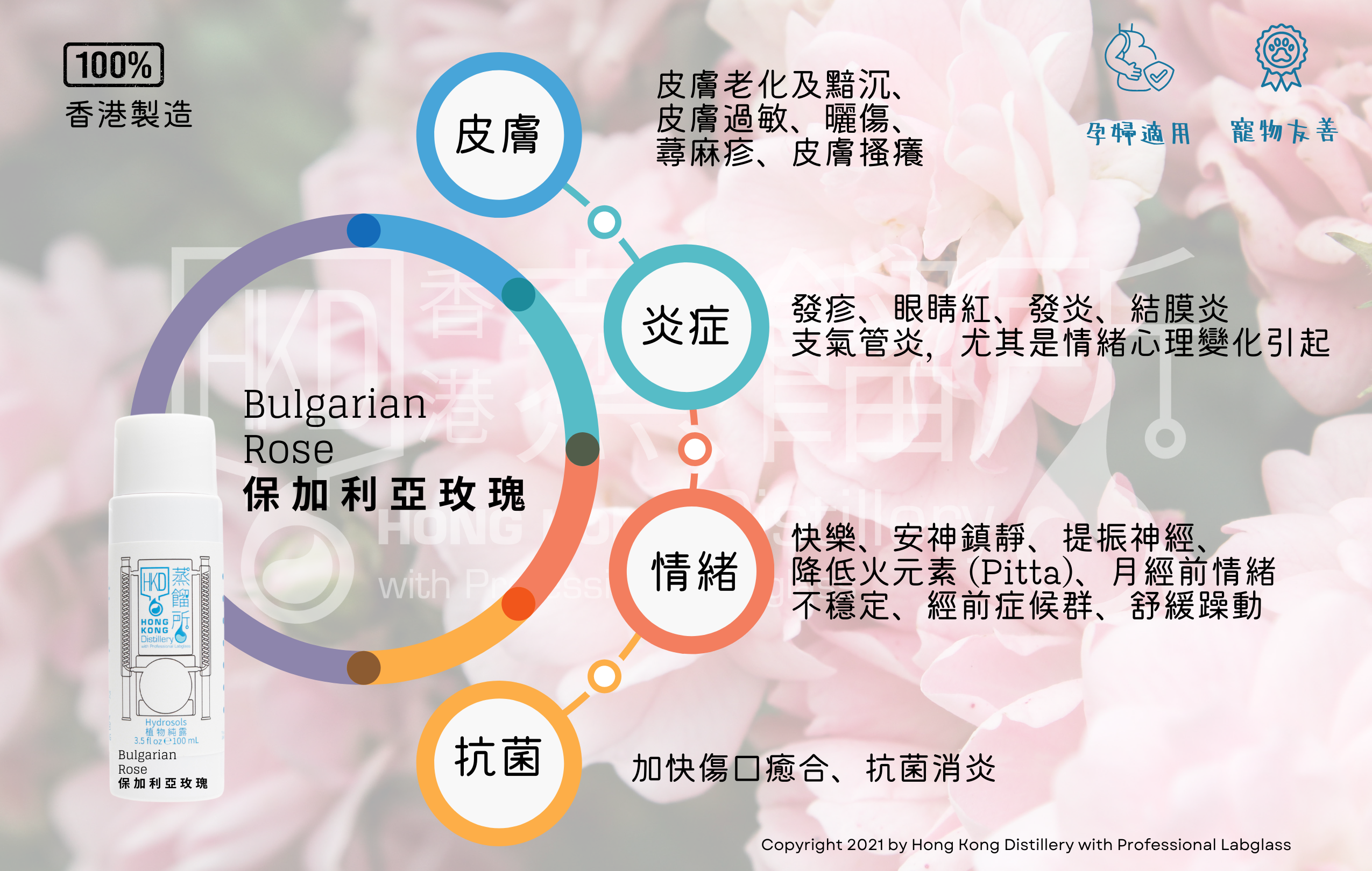 • 持續21天飲用玫瑰純露或有助平衡內分泌系統、改善經前症候群、經痛、經血不暢及情緒起伏不定。或有益自律神經系統、促進體內平衡、協助情緒運做。對便秘也有幫助。