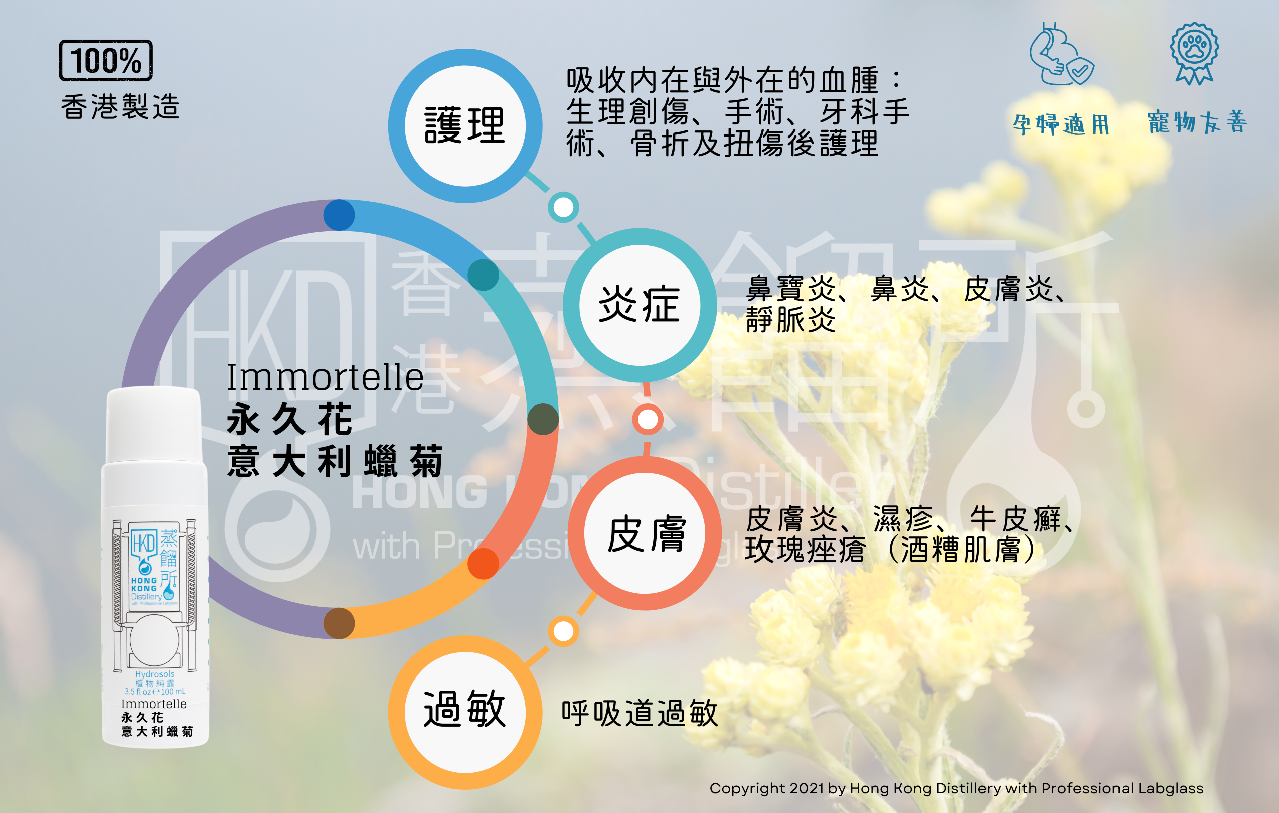 • 意大利永久花純露與岩玫瑰純露加在栓劑上可以用來處理子宮內膜異位、子宮肌瘤以及經痛問題;在任何手術後,使用她可以促進逢線處癒合,減輕腫脹,並且幫助肝臟排除麻醉劑