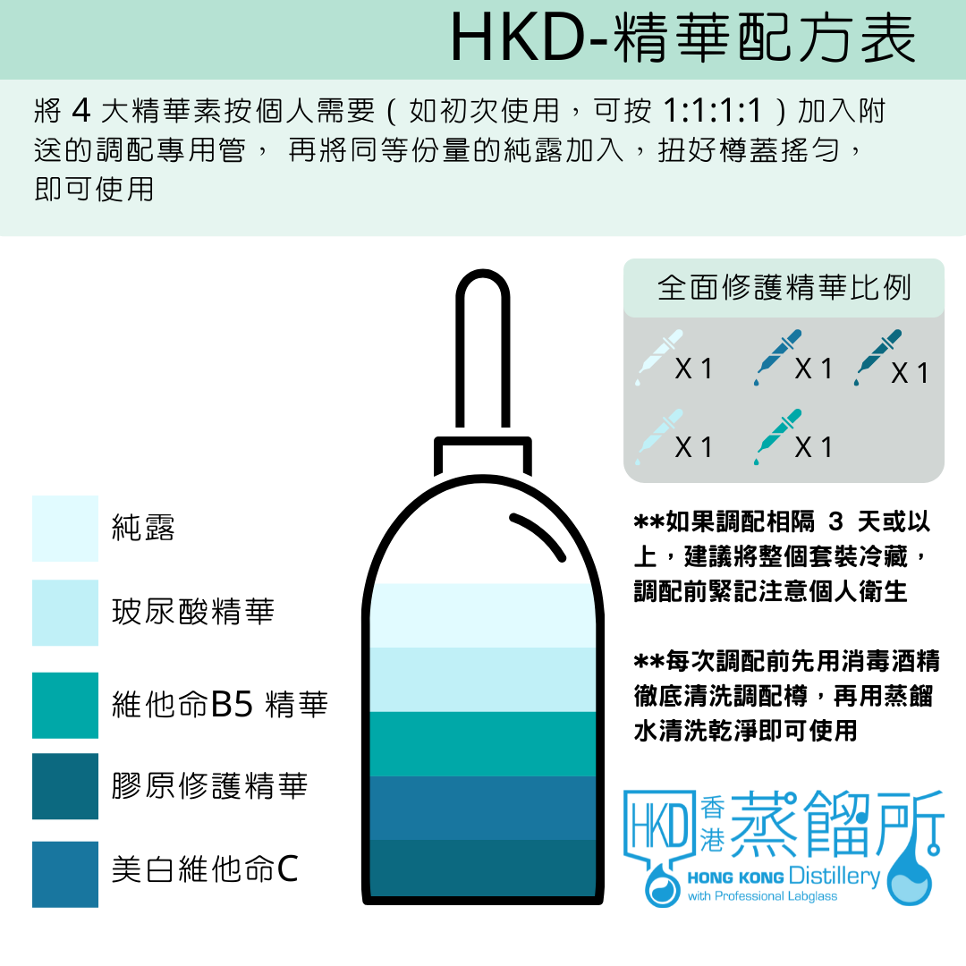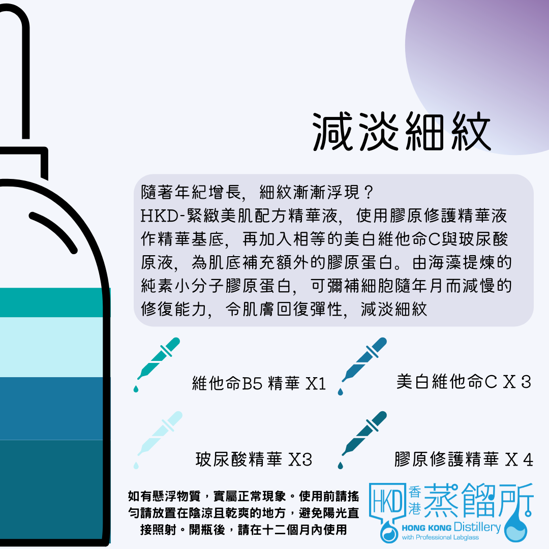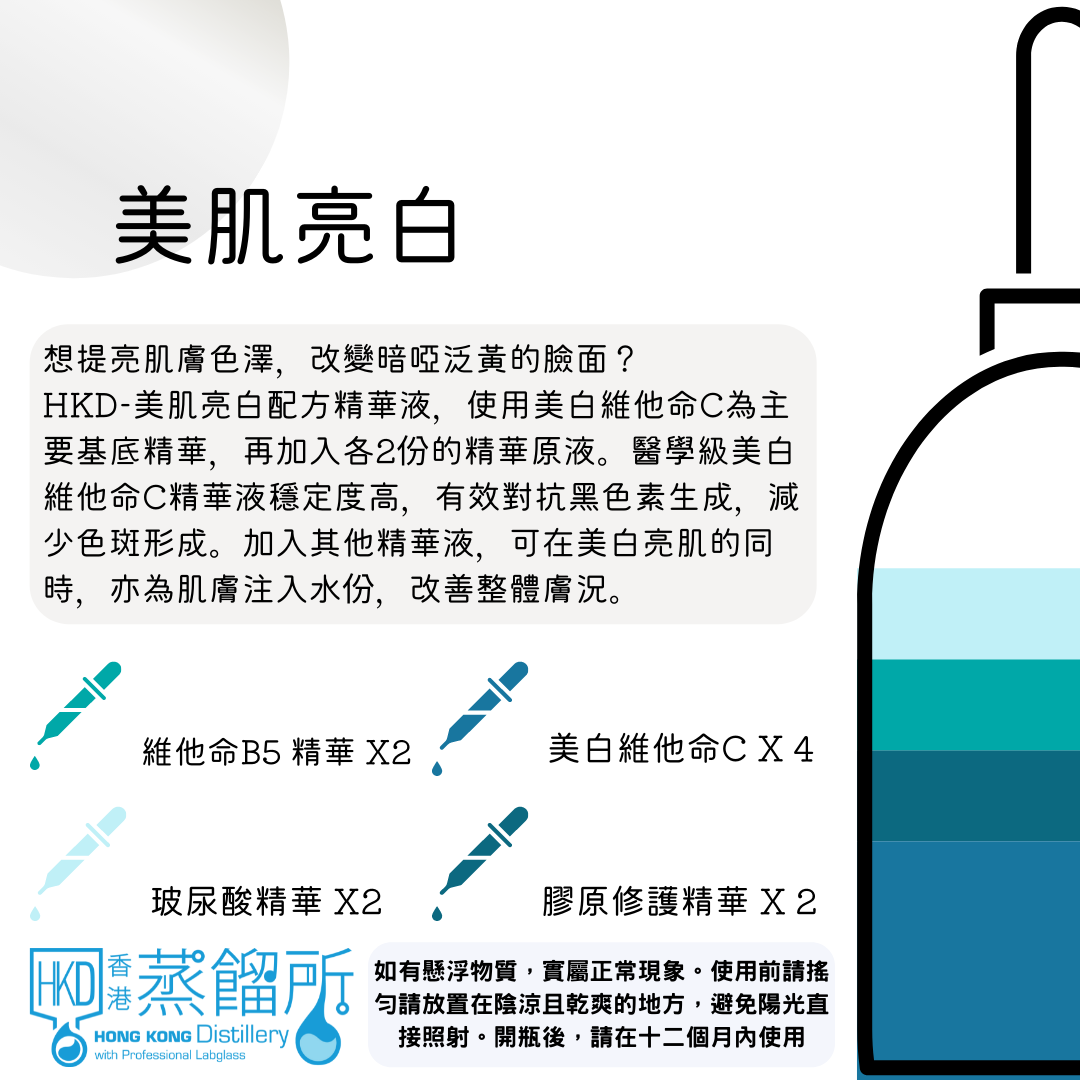 | 膠原修護精華 (Repair Serum) 隨年月增長、進出室內外溫差大。肌膚面對不同微創傷。彌補細胞的修復能力,膠原修護配方能為細胞外添骨膠原,令肌膚回復彈性。 | 維他命C 精華 (Vitamin C Serum) 蒸餾所採用具抗氧化功能的改良的醫學級維他命C,穩定性高,不會變黃橙色,為細胞消除有害氧化物和自由基,亦對淡斑、去細紋有幫助。適合夜間淡斑美白。 |