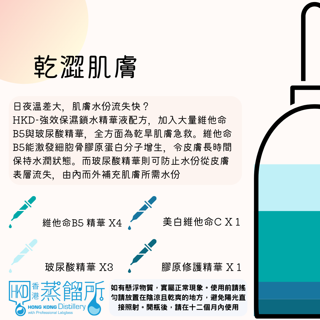 | 100%玻尿酸精華 (100% Hyaluronate) 使用了不同大小分子質量的玻尿酸(透明質酸),組成完美的快速保濕配方,同時具有滲透和修護功能,解決突發性乾旱。 | 維他命B5精華 (Vitamin B5 Hydrate) 研發團隊將維他命B5,B3及B6 調配成為長效保濕配方,適合日夜使用,讓皮膚提升自身的鎖水保濕能力,達到長效保濕。配方中B3和B6 更驅使細胞自行製造膠原蛋白,回復肌膚彈性。